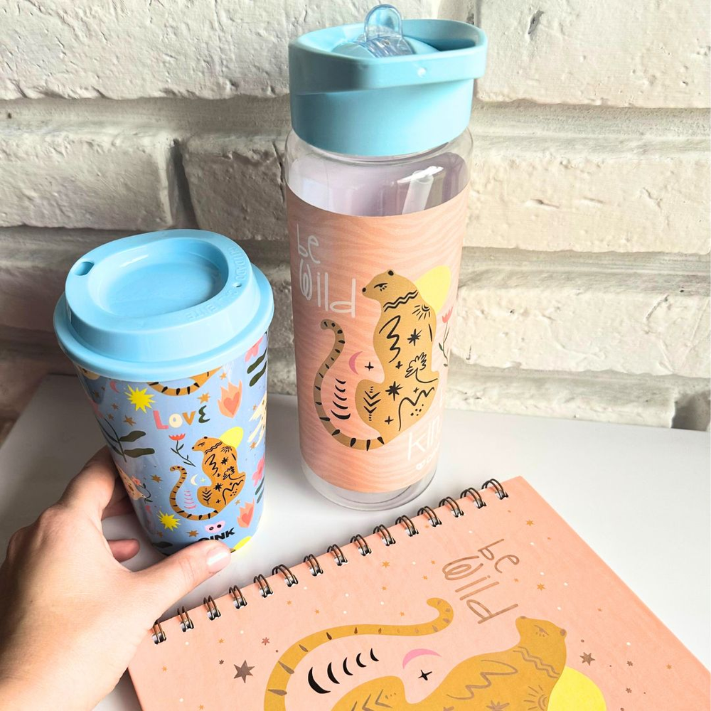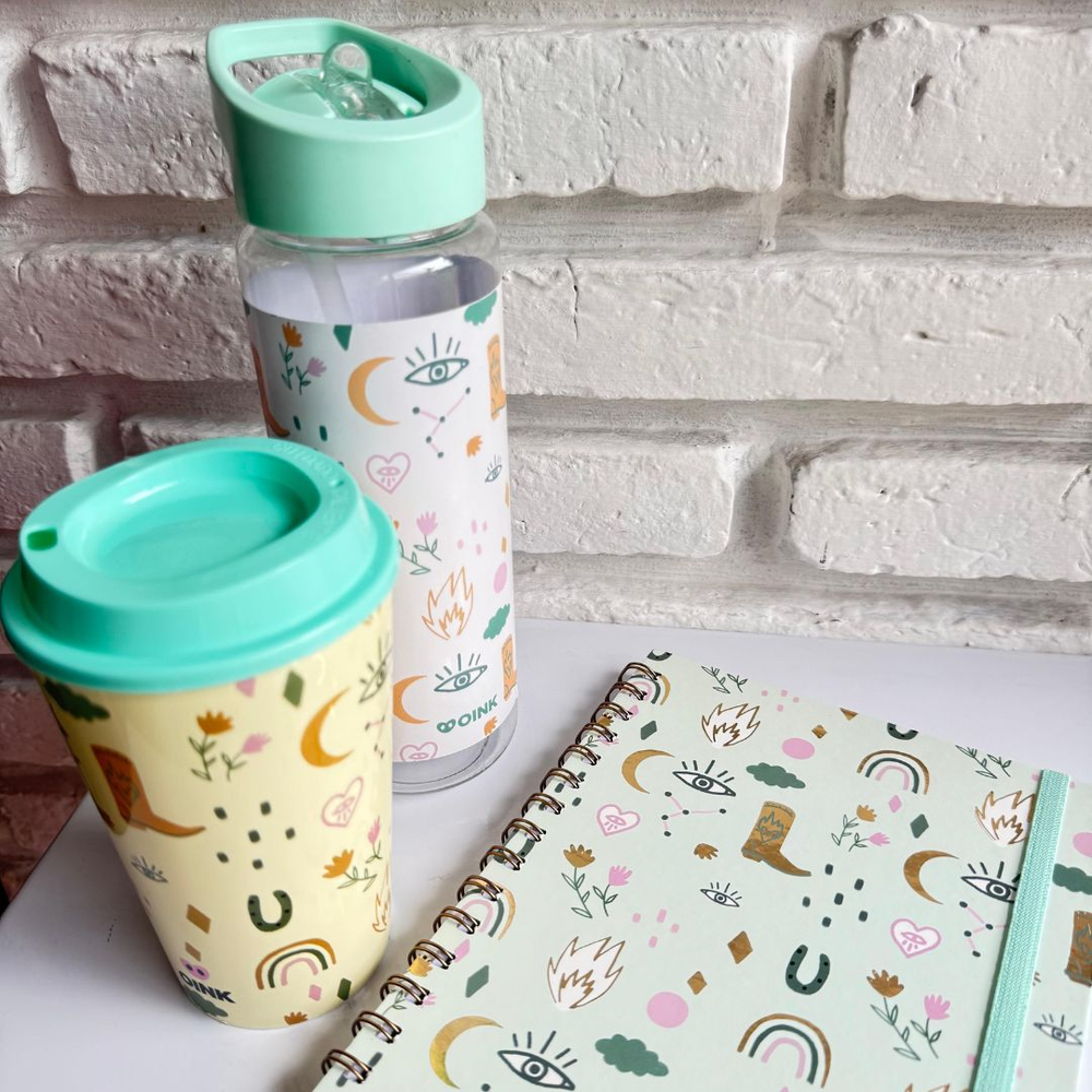 Este kit incluye: Botella de agua para estar siempre hidratado , Cuaderno tapa dura con hojas rayadas para tus anotaciones y proyectos, y un mug térmico de café recargar energías!