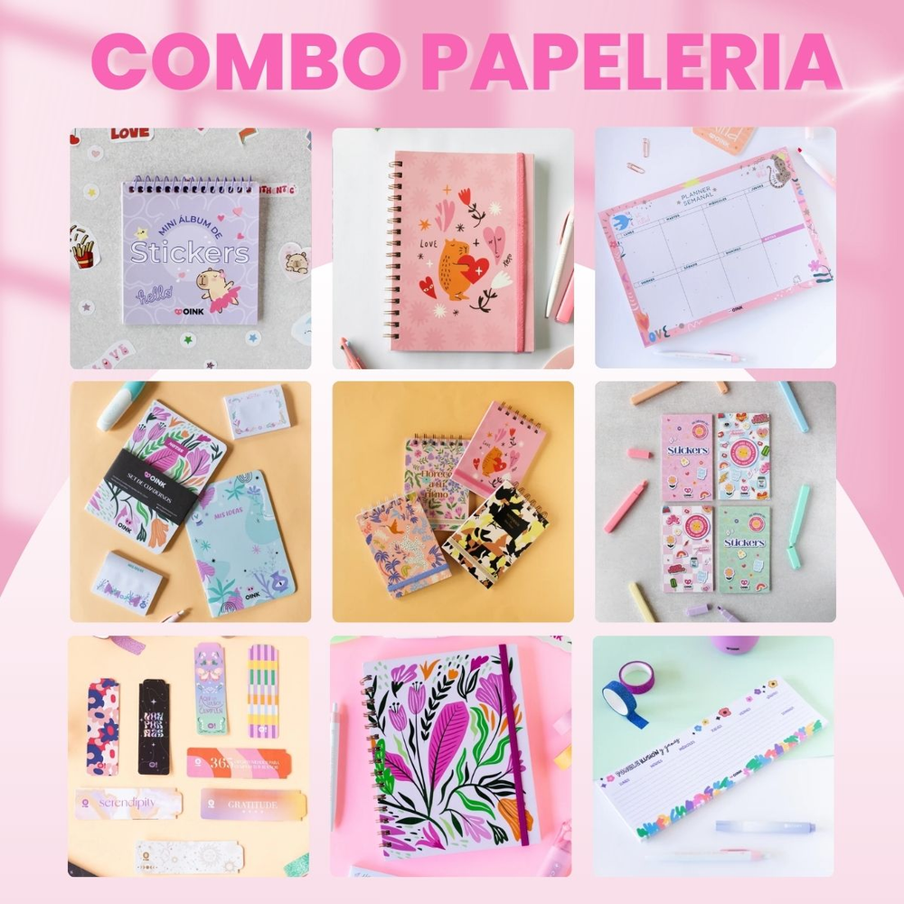 Este combo incluye: SEÑALADOR IMANTADO 20 SET DE 2 CUADERNOS TAPA BLANDA 8 LIBRETAS CON ELASTICO 16 CUADERNOS A5 TAPA FLEX 8 PLANNER SEMANAL A4 8 MINI ALBUM DE STICKERS 8 LIBRETA DE STICKERS 8 CUADERNOS A5 TAPA DURA 6 PLANNER SEMANAL ESCRITORIO 8 LIBRETAS BINDER EN PROMO 8 KIT GOMAS FANTASY 6